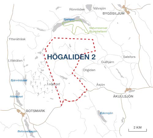 In December 2023, Holmen submitted a permit application to build and operate a wind farm, Högaliden 2, in Robertsfors Municipality. The planned wind farm is located northeast of Botsmark and southwest of Bygdsiljum and the application means that Holmen is applying for permission to build a maximum of 26 wind turbines with a total height of up to 300 metres. Expected electricity production is 650 GWh per year.