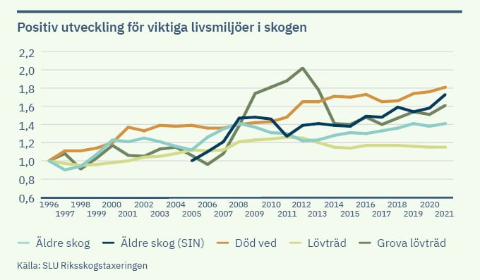 Ambitionen för de utvalda indikatorerna är en positiv trend över tid. Med en produktionscykel i skogen på nära hundra år sker förändringar inte över en natt, men statistik från de oberoende inventeringarna visar att utvecklingen de senaste 30 åren varit positiv.